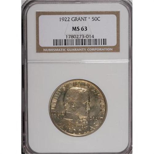 <B>1922 50C Grant with Star MS63 NGC.</B></I> Golden-tan patina is slightly deeper on the reverse of this lustrous Select Grant with Star half dollar, and an exacting strike brings about strong definition on the design elements. A few unobtrusive handling marks define the grade. Great overall eye appeal.<BR><BR><b>Shipping:</b> Coins & Currency (<a target="_blank" href="http://www.heritageauctions.com/common/shipping.php">view shipping information</a>)