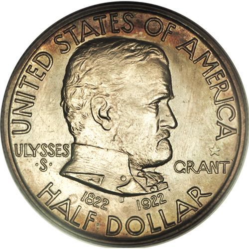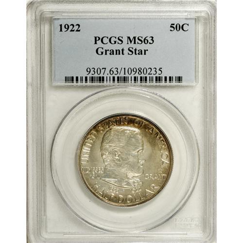 <B>1922 50C Grant with Star MS63 PCGS.</B></I> While the Missouri and Alabama design varieties purported to link to the celebration at hand, the pointless star on a handful of the Grant half dollars and dollars abandoned even this pretense. This Select example is well struck and luminous. Arcs of orange and plum at the periphery surround untoned centers. A few light abrasions on each side account for the grade.<BR><BR><b>Shipping:</b> Coin/Currency (<a target="_blank" href="http://www.heritageauctions.com/common/shipping.php">view shipping information</a>)