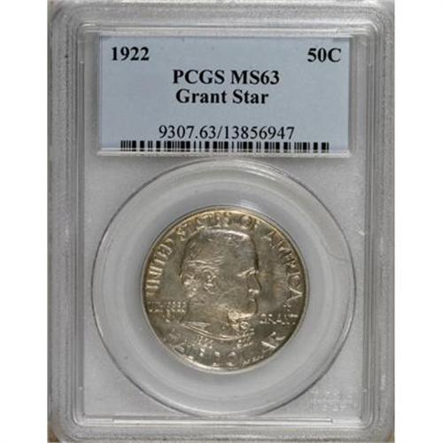 <B>1922 50C Grant with Star MS63 PCGS.</B></I> While the promoters of the Grant half dollar and gold dollar wanted three varieties total, they received four, as the star they requested on 5,000 of the gold dollars appeared on 5,000 silver halves as well. Soft blue and gold patina graces the chromelike surfaces of this Select example. Well-defined with light abrasions that account for the grade.<BR><BR><b>Shipping:</b> Coins & Currency (<a target="_blank" href="http://www.heritageauctions.com/common/shipping.php">view shipping information</a>)