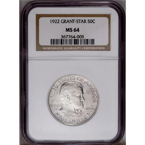 <B>1922 50C Grant with Star MS64 NGC.</B></I> Mostly brilliant surfaces with satiny, white luster, accented by only a trace of deep russet and blue toning at the base of the reverse. Myriad die polishing lines in the fields are typical of this variety.