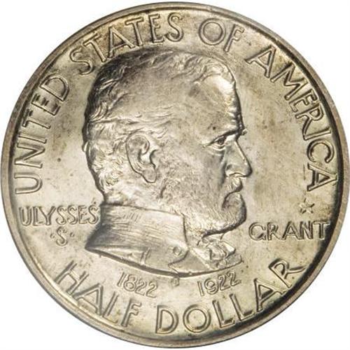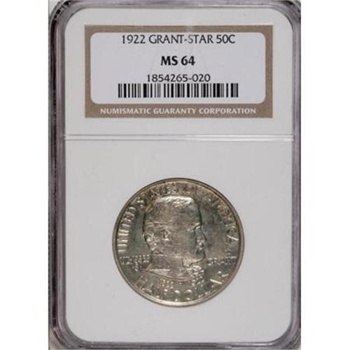 <B>1922 50C Grant with Star MS64 NGC.</B></I> No clash marks are present near the G in GRANT and the cravat, an unusual feature for the With Star variety, and indicative of an early die state. This near-Gem, lightly toned overall with metallic luster, is well-defined save for a soft spot near Grant's temple. Faint tan and gold patina appears on each side, as does deeper bronze color near the footpath to the boyhood home. Minimally marked on the devices, though a handful of wispy abrasions in the fields preclude a finer grade.<BR><I></B></I><BR><BR><b>Shipping:</b> Coins & Currency (<a target="_blank" href="http://www.heritageauctions.com/common/shipping.php">view shipping information</a>)