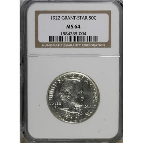 <B>1922 50C Grant with Star MS64 NGC.</B></I> A minimally toned near-Gem representative of this lower-mintage Grant half dollar variety, lustrous with prominent die polish lines evident in the obverse fields. Well struck overall, though the trees framing the house on the reverse show slight softness. Overall, an excellent rendition of this Laura Gardin Fraser design.<BR><BR><b>Shipping:</b> Coins & Currency (<a target="_blank" href="http://www.heritageauctions.com/common/shipping.php">view shipping information</a>)