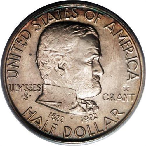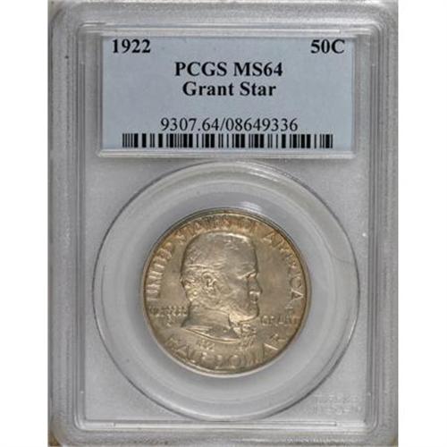 <B>1922 50C Grant with Star MS64 PCGS.</B></I> With only 4,256 of the Star variety produced, the Grant was one of the early 1920s commemoratives that created artificial varieties with design changes, a practice made infamous by later issues in the 1930s. This example has light gold patina at the periphery and pearl-gray surfaces with heavy die polish. A few small marks on the obverse preclude Gem status for this sharply struck piece. <BR><BR><b>Shipping:</b> Coins & Currency (<a target="_blank" href="http://www.heritageauctions.com/common/shipping.php">view shipping information</a>)
