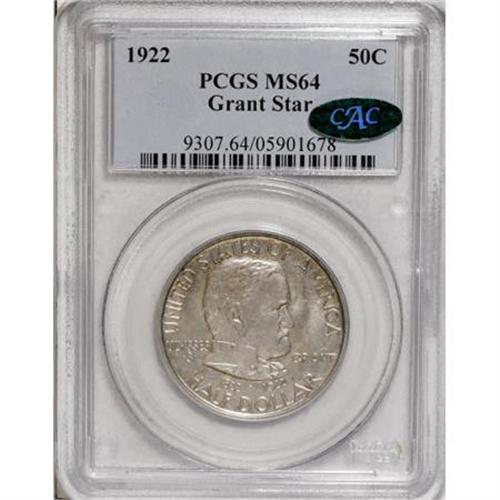 <B>1922 50C Grant with Star MS64 PCGS. CAC.</B></I> This satiny Grant with Star half lacks the heavy die polish lines usually present on the right obverse field, and there are no signs of clash marks near the bust tip. While die states on commemorative coins seldom command a premium, this example might prove an exception. Pearl-gray toning embraces the nearly mark-free surfaces.<BR><BR><b>Shipping:</b> Coins & Currency (<a target="_blank" href="http://www.heritageauctions.com/common/shipping.php">view shipping information</a>)