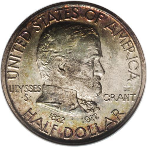 <B>1922 50C Grant with Star MS65 NGC.</B></I> Lime and powder-blue adorn the obverse center, which is framed by rose-red patina. The reverse has a largely untoned frame house and foliage, while the border is light golden-brown and aqua-blue. A satiny and beautifully preserved Gem that lacks the distracting strike doubling sometimes seen on E PLURIBUS UNUM. A much better silver commemorative issue.<BR><BR><b>Shipping:</b> Coin/Currency (<a target="_blank" href="http://www.heritageauctions.com/common/shipping.php">view shipping information</a>)