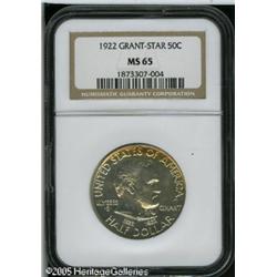 <B>1922 50C Grant with Star MS65 NGC.</B></I> Only 4,256 pieces were struck of this issue, making certain that this early commemorative would be an absolute rarity. It is also a highly respected condition rarity as few examples were well taken care of, many having been sold to the non-collecting public. As always, the fields display noticeable die polishing marks which have imparted a semi-prooflike sheen on each side. Equally bright over the devices. Most of each side is brilliant with a smidgen of golden toning on the peripheries. Population: 180 in 65, 40 finer (1/05). Lot:8498