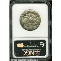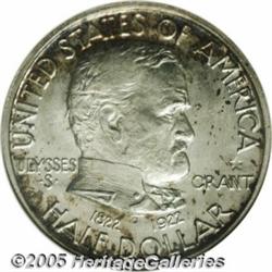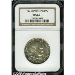 <B>1922 50C Grant with Star MS65 NGC.</B></I> The satiny textured surfaces readily reveal the scattered die striations (as struck) in the obverse field that are seen on most representatives of this type. The strike is uncommonly bold, and the surfaces have survived the passage of time acquiring a mottled overlay of natural patina that deepens slightly toward the obverse border. The 1922 Grant with Star Commemorative has a limited original mintage of 4,256 pieces. A conditionally challenging issue that is unquestionably rare at the MS66 level, this particular coin is a flashy representative of this key date issue. Population: 181 in 65, 41 finer (2/05).