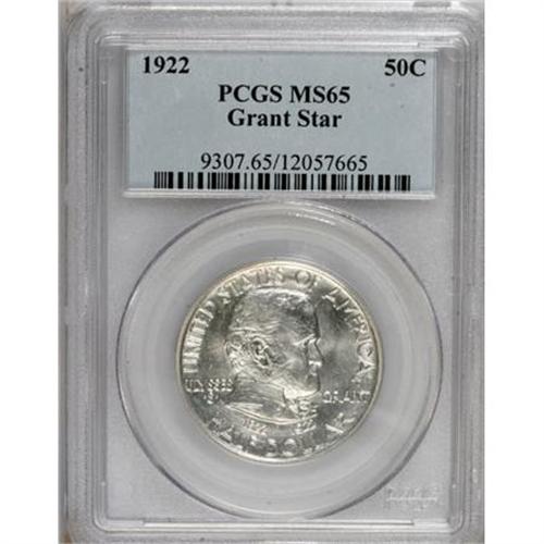 <B>1922 50C Grant with Star MS65 PCGS.</B></I> The Grant with Star half is one of the rarest of all commemorative issues. It has been widely recognized as a key issue for decades, and even the "Plain" Grant is many times scarcer than other commemorative halves. This is an especially attractive example that has snow-white surfaces and a bright, satiny sheen. Free from any noticeable abrasions. <BR><BR><b>Shipping:</b> Coins & Currency (<a target="_blank" href="http://www.heritageauctions.com/common/shipping.php">view shipping information</a>)