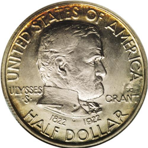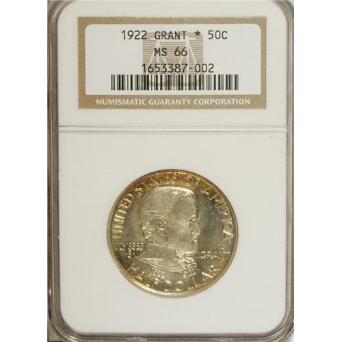 <B>1922 50C Grant with Star MS66 NGC.</B></I> For the projected mintage of 10,000 Grant gold dollars, the distributors requested two varieties, half with an incuse star in the right obverse field and half without. Through a miscommunication (source unknown), the Mint also coined 5,000 <I>half</B></I> dollars with the star in the field as well. The distributors opted not to question their good fortune, and both Grant denominations became examples of the dubious practices associated with classic commemoratives.<BR> With a net mintage of only 4,256 pieces, any Grant with Star half is a prize, and Gems are conditionally scarce. This essentially unmarked coin is a clear step up from that level, strongly lustrous with orange and gold patina at the margins. Both sides show minor evidence of die clashing in the fields. NGC has graded only eight coins finer, three in MS66 <img border='0' src='http://www.heritagecoins.com/images/star.gif' width=10 height=10> and five in MS67 (3/07).<BR><I>From The Cary & Cheryl Porter Collection.</B></I><BR><BR><b>Shipping:</b> Coins & Currency (<a target="_blank" href="http://www.heritageauctions.com/common/shipping.php">view shipping information</a>)
