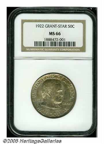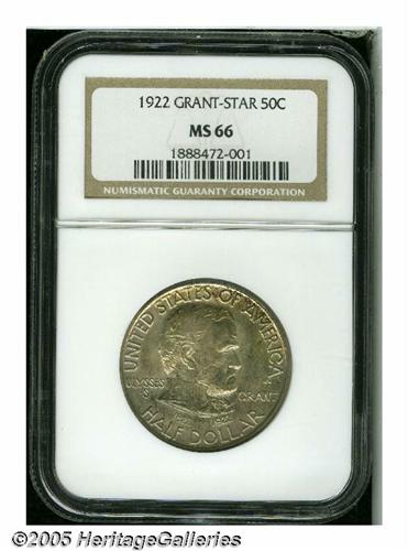 <B>1922<50C> Grant with Star MS66 NGC.</B></I> Steel-gray tones over luster and boldly struck. The reverse shows a scattering of tiny speckles over similar steel-gray found on the obverse. A very tough coin to find this nice, and virtually impossible a point higher. the With Star coins are always in strong demand and elusive. Population: 38 in 66, 5 finer (6/05).