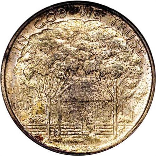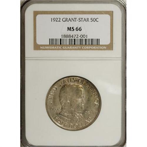 <B>1922 50C Grant with Star MS66 NGC.</B></I> Subtle lilac and gray toning is splashed with iridescent accents on this bold Premium Gem. Similar reverse toning has additional tiny gray speckles at the center. Reflective satin luster beneath the toning is created by extremely heavy die polish in the fields that give the variety its characteristic look.<BR> It proved to be a bonus when the issuing agency received these With Star half dollars. They requested a special mark on half of the 10,000 gold dollars. When the order arrived, they found to their delight that 5,000 gold dollars and 5,000 half dollars had the incuse star. Census: 40 in 66, 5 finer (6/07).<BR><BR><b>Shipping:</b> Coins & Currency (<a target="_blank" href="http://www.heritageauctions.com/common/shipping.php">view shipping information</a>)