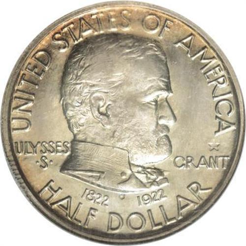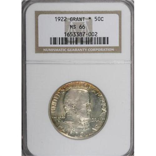 <B>1922 50C Grant with Star MS66 NGC.</B></I> For the projected mintage of 10,000 Grant gold dollars, the distributors requested two varieties, half with an incuse star in the right obverse field and half without. Through a miscommunication (source unknown), the Mint also coined 5,000 <I>half</B></I> dollars with the star in the field as well. The distributors opted not to question their good fortune, and both Grant denominations became examples of the dubious practices associated with classic commemoratives.<BR> With a net mintage of only 4,256 pieces, any Grant with Star half is a prize, and Gems are conditionally scarce. This essentially unmarked coin is a clear step up from that level, strongly lustrous with orange and gold patina at the margins. Both sides show minor evidence of die clashing in the fields. NGC has graded only eight coins finer, three in MS66 <B><img src="/images/star.gif" width="10" height="10" alt="" border="0"></B></I> and five in MS67 (11/07).<BR><I></B></I><BR><BR><b>Shipping:</b> Coins & Currency (<a target="_blank" href="http://www.heritageauctions.com/common/shipping.php">view shipping information</a>)
