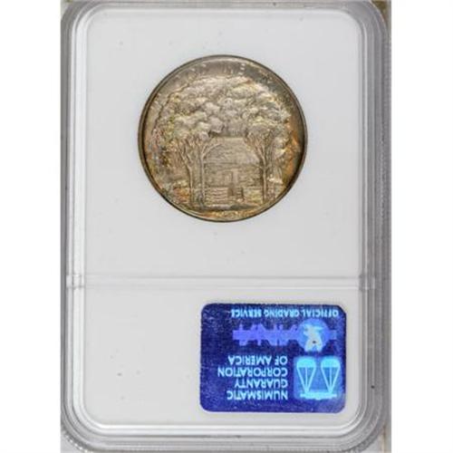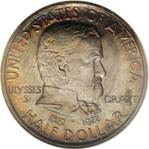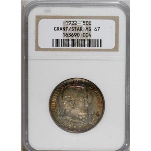 <B>1922 50C Grant with Star MS67 NGC.</B></I> Despite his perceived shortcomings as President, Ulysses S. Grant has received a number of numismatic honors after his death, many in commemoration of his time as a Civil War general. His portrait appears on the fifty dollar note, and in 1922, the centennial of his birth, Philadelphia struck two commemoratives bearing his image, a dollar in gold and a half dollar in silver.<BR> The piece offered here is a delightful, carefully preserved example of the elusive With Star half dollar type, which has a net mintage of just 4,256 pieces. Its nearly flawless surfaces exhibit pleasing luster beneath soft plum, blue-gray, gold-orange, and ruby patina. The unaided eye detects only a single minuscule flaw in the right obverse field. A top-notch classic commemorative condition rarity. One of eight coins in a tie for finest known, five graded by NGC and three by PCGS (10/07).<BR><BR><b>Shipping:</b> Coins & Currency (<a target="_blank" href="http://www.heritageauctions.com/common/shipping.php">view shipping information</a>)