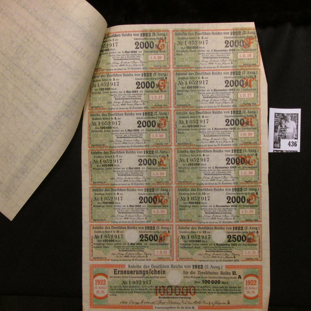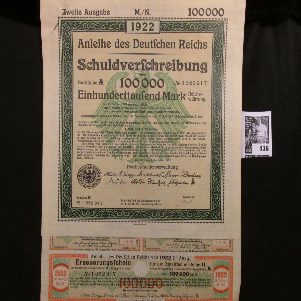 1922 "Anleihe des Deutschen Reichs Schuldverschreibung" (Bond of the German Reich debt) 100,000 Mark Bond with all coupons attached.