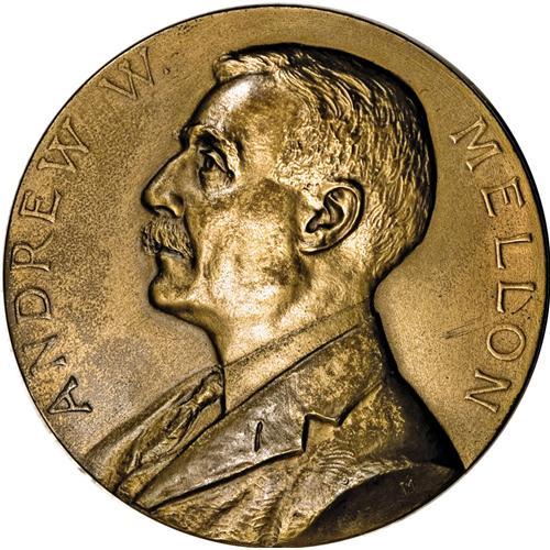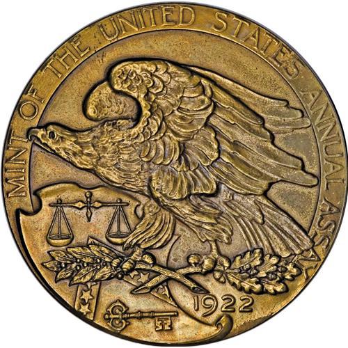 <B>1922 Assay Commission Medal. MS63 Uncertified.</B></I> Julian AC-66, R.4. Bronze, 50.9 mm., 882.7 grains. A signed medal with the name of commission member B.G. Shields engraved on the edge. Treasury Secretary Andrew W. Mellon is depicted on the obverse, in profile view facing left, with his name in the left and right fields. The reverse has a defiant eagle facing to the left, holding crossed branches of oak and olive. The legend MINT OF THE UNITED STATES ANNUAL ASSAY follows the border with the date at lower right. Treasury scales and key appear at the lower left, on a curled shield. The obverse has a small M on the truncation, identifying George Morgan as the engraver. The reverse was also by Morgan, although Francis Pessolano-Filos incorrectly identified the engraver of the reverse as John Sinnock. This example is struck in yellow-bronze with splashes of deeper olive toning on both sides.<BR> Mr. B.G. Shields, to whom this medal was originally presented, served on the Assay Commission as chairman of the committee on assaying. Shields was employed by the U.S. Assay Office in New York, although his exact capacity with that facility is not known.