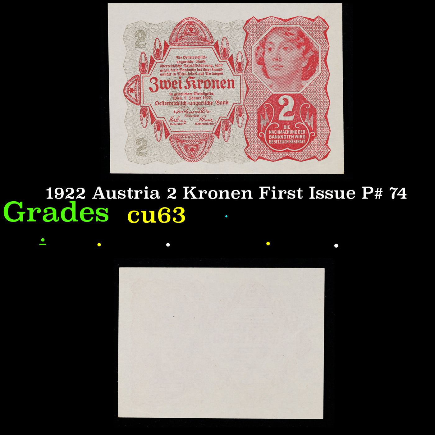 1922 Austria 2 Kronen First Issue P# 74 Grades Select CU.