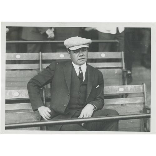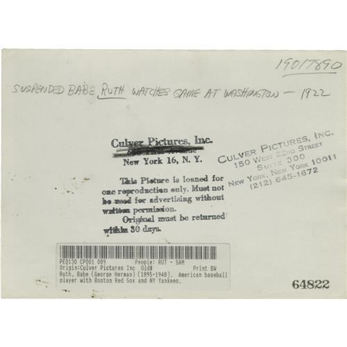 <B>1922 Babe Ruth Culver Service Photograph, Type 2.</B></I> Handwritten notation on verso describes the scene as, "Suspended Babe Ruth watches game at Washington, 1922." Stamping on verso credits the image to "Culver Pictures, Inc." 5x7". No condition problems. Confirmed as "Type 2" by PSA/DNA. CGC grade: Very Fine.