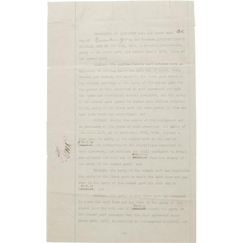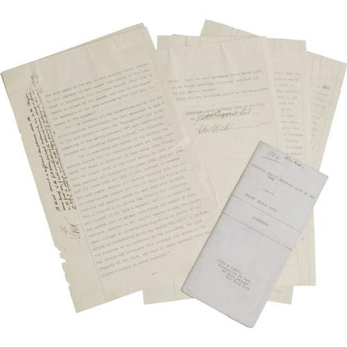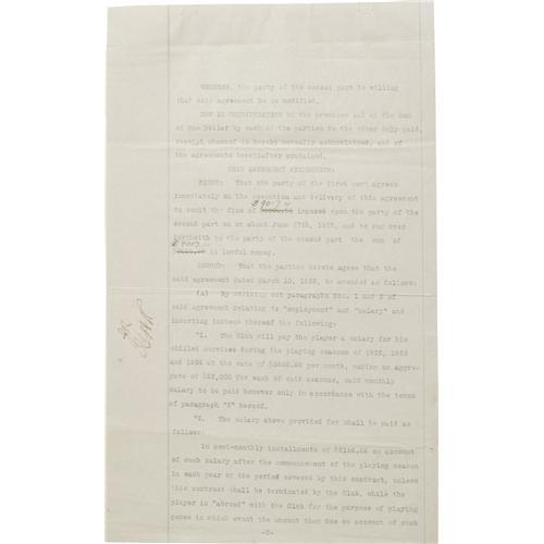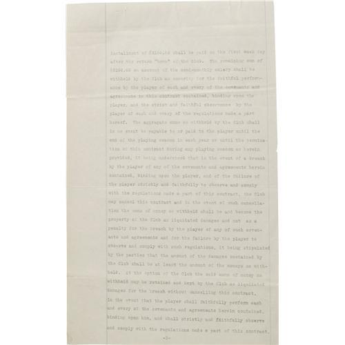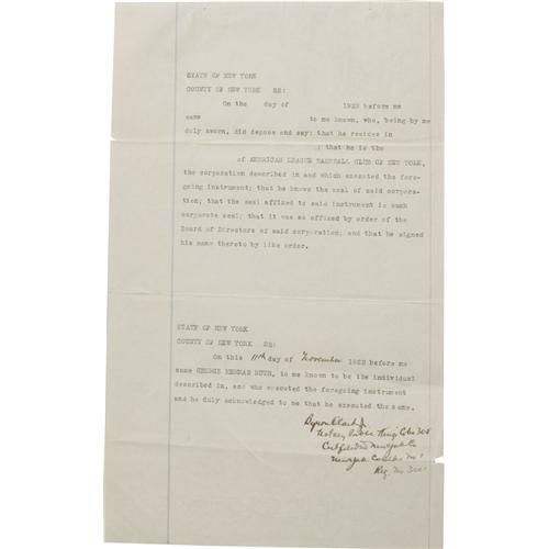 <B>1922 Babe Ruth Signed Contract Addendum Limiting His Drinking, Late Nights.</B></I><BR><BR> <I>"I'll promise to go easier on drinking and to get to bed earlier, but not for you, fifty thousand dollars, or two-hundred and fifty thousand dollars will I give up women. They're too much fun."<BR><BR> --Babe Ruth to Col. Jacob Ruppert, 1922</B></I><BR><BR><BR> New York Yankees owner Colonel Jake Ruppert was concerned. The year 1922 had been a tumultuous one for his superstar slugger, whose poor behavior had kept the Babe in the scandal rags, and out of the line-up, far more than a man earning over three times as much as his next biggest player's salary should be. After missing six weeks at the beginning of the season due to Judge Landis' suspension for barnstorming infractions, Ruth went just five days before being stripped of his captain's stripes for throwing dirt on an umpire and then directing a vulgar gesture at a heckler in the stands. In mid-June, he was tossed twice on consecutive days. By August, Ruth had been suspended by the League five times.<BR><BR> And while receiving just 110 games of service for his $52,000 annual commitment to the Babe, Ruppert received almost daily briefings of the Babe's off-field behavior, the drinking, the carousing, the many late nights. He was convinced that all of these factors were connected, and that the time had come to rein in the Bacchanalian Babe. After all, the club was moving to an palatial new baseball grounds in the Bronx the next season. This sort of behavior just wouldn't do. If Babe Ruth was really worth one thousand dollars a week, he had better start acting like an adult.<BR><BR> It was this revelation on the part of the frustrated Yankee patriarch that spawned the incredible document we present here, almost certainly the first "substance abuse" agreement ever conceived in the course of American athletics. Six typed legal-size pages spell out the terms that would hopefully curb Ruth's self-destructive tendencies, and help earn the New York Yankees their first World Championship. In essence, it is an opportunity for Ruth to reclaim the sum of $9,017.10 he had been fined "for infraction of the regulations" as stipulated in his historic thousand dollar per week contract. The terms of this November 11, 1922 contract addendum are stated as follows:<BR><BR><BR> <I>"It is understood and agreed by and between the parties hereto that the regulation above set forth, numbered '2' shall be construed to mean among other things, that the player shall at all times during the term of this contract and throughout the years 1922, 1923 and 1924, and the years 1925 and 1926 if this contract is renewed for such years, refrain and abstain entirely from the use of intoxicating liquors and that he shall not during the training and playing season in each year stay up later than 1 o'clock A.M. on any day without the permission and consent of the Club's manager, and it is understood and agreed that if at any time during the period of this contract, whether in the playing season or not, the player shall indulge in intoxicating liquors or be guilty of any action or misbehavior which may render him unfit to perform the services to be performed by him hereunder, the Club may cancel and terminate this contract and retain as the property of the Club, any sums of money withheld from the player's salary as above provided."</B></I><BR><BR><BR> Though the Colonel, a good family man, was none too happy about the Babe's womanizing, he understood that any regulations levied in that regard would be a lost cause. With Ruth's wife, a demure woman uncomfortable with the New York City spotlight, maintaining the family residence in Boston, the Babe was free to operate as a swinging bachelor. And while every story we hear about Ruth would lead us to believe he signed the terms as listed with fingers crossed, a gentleman's agreement to exclude marital fidelity from the terms was made as well. The sixth and final page bears the consenting signatures of the two parties in unique and desirable variations: "Jac. H. Ruppert, Prst." and "Geo. H. Ruth." The notary's signature is here as well, with all three presenting at 9+/10 strength. Furthermore, where handwritten changes have been made on the second, third and fifth pages, both Ruppert and Ruth have initialed their consent, also in the boldest of black fountain pen ink. Some minor separation at a few of the original storage folds causes no concern, and all pages remain solid and complete. The original file envelope, entitled "American League Baseball Club of New York with George Herman Ruth Agreement," is here as well.<BR><BR> The exploits of George Herman Ruth, both on and off the playing field, have become a treasured chapter in American folklore. His rags to riches rise from the orphanage to the height of international fame, his tremendous appetites for wine, women and song, his dominance of our National Pastime, all of it makes him the most beloved and recognized sports figure of the twentieth century. Perhaps no other piece on earth so succinctly captures "the essence of the Babe," and Heritage is immensely pleased to offer this historic document to the collecting community. <I>LOA from PSA/DNA. LOA from James Spence Authentication.</B></I><BR><BR><b>Shipping:</b> Flat Material, Small (<a target="_blank" href="http://www.heritageauctions.com/common/shipping.php">view shipping information</a>)