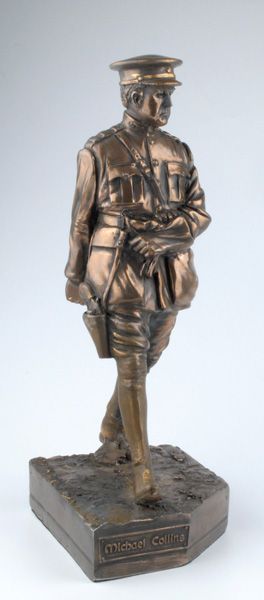 Resin cast figure of Michael Collins in Irish Free State Army uniform. Marked on base 'Lough Neagh Bronze'. Also with framed reproduction of a page from the London News 6 Novemeber 1920 showing the funeral of Terence McSwiney. (2 items)