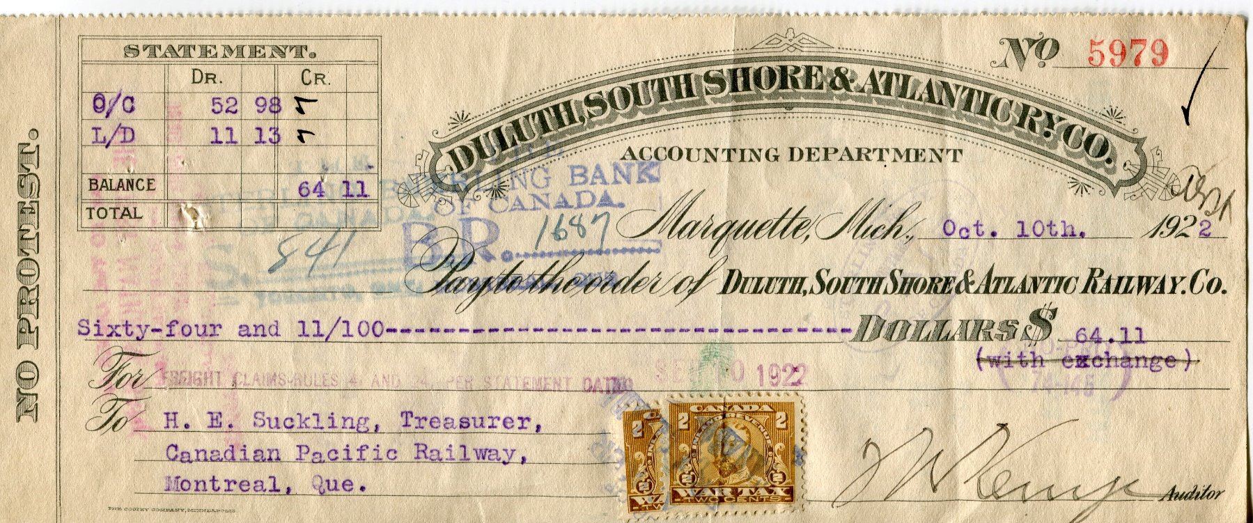 1922 CHEQUE (DULUTH, SOUTH SHORE 7 ATLANTIC RAILWAY CO.) *PAYMENT OF $64.11*