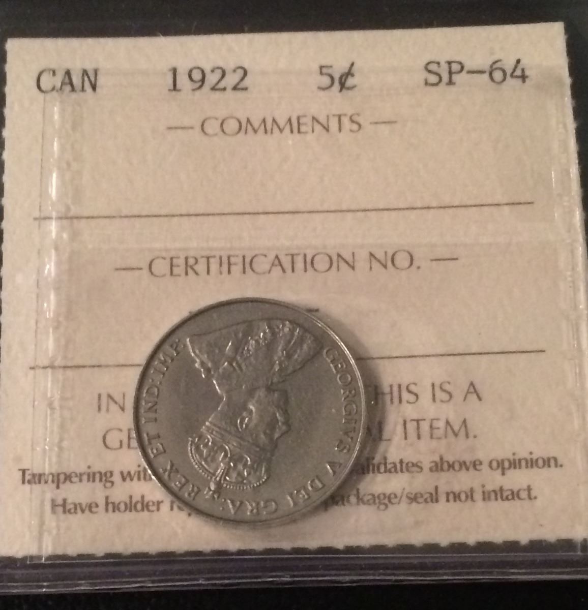 1922 Canada 5 Cent Far Rim ICCS Certifed SP-64