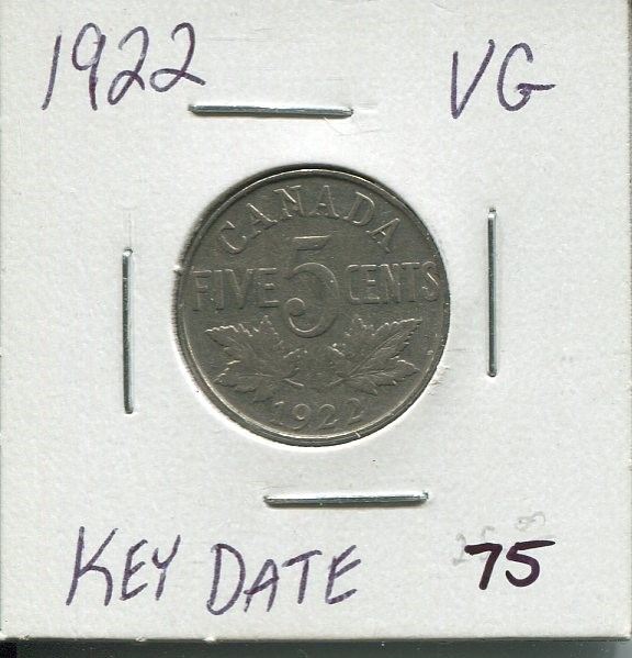 1922,Canadian 5 cent coin (KEY DATE),King George V