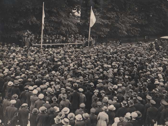 Possibly done during the heated debates in 1922 and found amongst Kennedy's private papers.The original photograph shows a large crowd in St. Stephen's Green in front of a platform of Provisional Government ministers including President Cosgrave and Attorney General Kennedy. (2 items)
