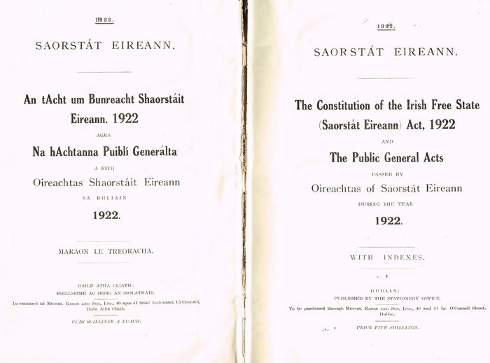 Official printed edition of The Constitution of the Irish Free State (Saorstát Eireann) Act 1922. Undated but printed circa 1940s. Also with The Railway and Carriers' Ready Reckoner by Thomas Shaw, published by John Falconer, Dublin. 1927 (2 items)