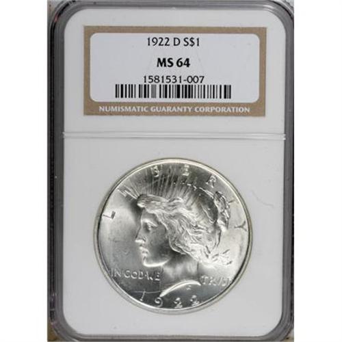 <B>1922-D $1 MS64 NGC.</B></I> NGC Census: (2220/841). PCGS Population (2582/1103). Mintage: 15,063,000. Numismedia Wsl. Price for NGC/PCGS coin in MS64: $74. (#7358)<BR><BR><b>Shipping:</b> Coins & Currency (<a target="_blank" href="http://www.heritageauctions.com/common/shipping.php">view shipping information</a>)