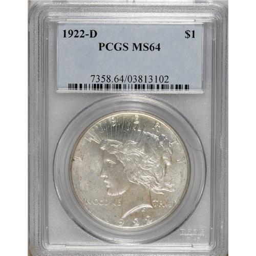 <B>1922-D $1 MS64 PCGS.</B></I> PCGS Population (2586/0). NGC Census: (2216/836). Mintage: 15,063,000. Numismedia Wsl. Price for NGC/PCGS coin in MS64: $74. (#7358)<BR><BR><b>Shipping:</b> Coins & Currency (<a target="_blank" href="http://www.heritageauctions.com/common/shipping.php">view shipping information</a>)