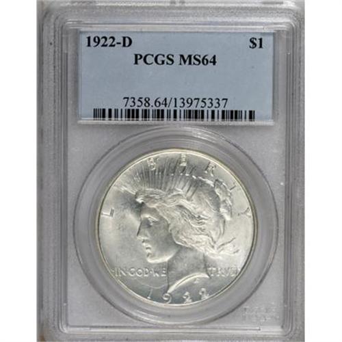 <B>1922-D $1 MS64 PCGS.</B></I> PCGS Population (2627/1139). NGC Census: (2230/848). Mintage: 15,063,000. Numismedia Wsl. Price for NGC/PCGS coin in MS64: $75. (#7358)<BR><BR><B>Coin Engraver:</B> Anthony de Francisci<BR><BR><b>Shipping:</b> Coins & Currency (<a target="_blank" href="http://www.heritageauctions.com/common/shipping.php">view shipping information</a>)
