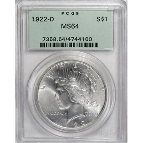 <B>1922-D $1 MS64 PCGS.</B></I> PCGS Population (2647/1147). NGC Census: (2278/867). Mintage: 15,063,000. Numismedia Wsl. Price for NGC/PCGS coin in MS64: $80. (#7358)<BR><BR><B>Coin Engraver:</B> Anthony de Francisci<BR><BR><b>Shipping:</b> Coins & Currency (<a target="_blank" href="http://www.heritageauctions.com/common/shipping.php">view shipping information</a>)