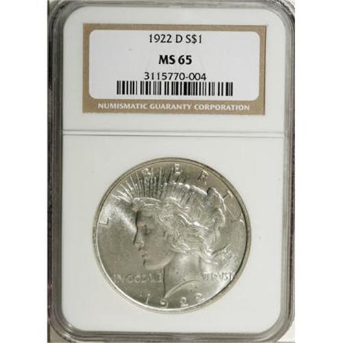 <B>1922-D $1 MS65 NGC.</B></I> NGC Census: (706/142). PCGS Population (996/139). Mintage: 15,063,000. Numismedia Wsl. Price for NGC/PCGS coin in MS65: $290. (#7358)<BR><BR><B>Coin Engraver:</B> Anthony de Francisci<BR><BR><b>Shipping:</b> Coins & Currency (<a target="_blank" href="http://www.heritageauctions.com/common/shipping.php">view shipping information</a>)