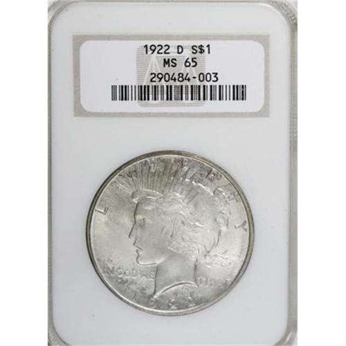 <B>1922-D $1 MS65 NGC.</B></I> . .. NGC Census: (718/144). PCGS Population (1003/139). Mintage: 15,063,000. Numismedia Wsl. Price for NGC/PCGS coin in MS65: $360. (#7358)<BR><BR><B>Coin Engraver:</B> Anthony de Francisci<BR><BR><b>Shipping:</b> Coins & Currency (<a target="_blank" href="http://www.heritageauctions.com/common/shipping.php">view shipping information</a>)