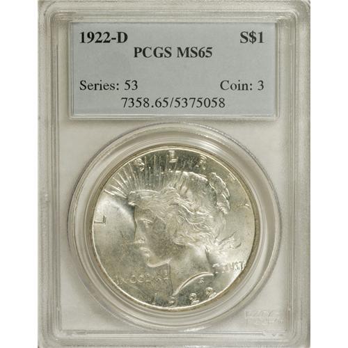 <B>1922-D $1 MS65 PCGS.</B></I> PCGS Population (965/136). NGC Census: (695/141). Mintage: 15,063,000. Numismedia Wsl. Price for NGC/PCGS coin in MS65: $284. (#7358)<BR><BR><b>Shipping:</b> Coins & Currency (<a target="_blank" href="http://www.heritageauctions.com/common/shipping.php">view shipping information</a>)