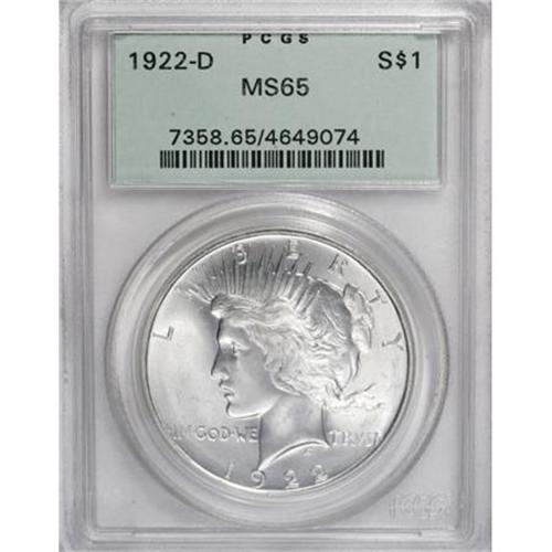 <B>1922-D $1 MS65 PCGS.</B></I> . PCGS Population (1003/139). NGC Census: (718/144). Mintage: 15,063,000. Numismedia Wsl. Price for NGC/PCGS coin in MS65: $360. (#7358)<BR><BR><B>Coin Engraver:</B> Anthony de Francisci<BR><BR><b>Shipping:</b> Coins & Currency (<a target="_blank" href="http://www.heritageauctions.com/common/shipping.php">view shipping information</a>)