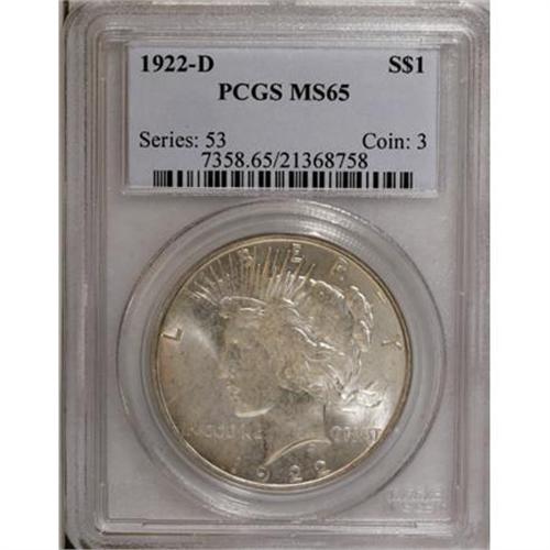 <B>1922-D $1 MS65 PCGS.</B></I> . PCGS Population (1003/139). NGC Census: (718/144). Mintage: 15,063,000. Numismedia Wsl. Price for NGC/PCGS coin in MS65: $360. (#7358)<BR><BR><B>Coin Engraver:</B> Anthony de Francisci<BR><BR><b>Shipping:</b> Coins & Currency (<a target="_blank" href="http://www.heritageauctions.com/common/shipping.php">view shipping information</a>)