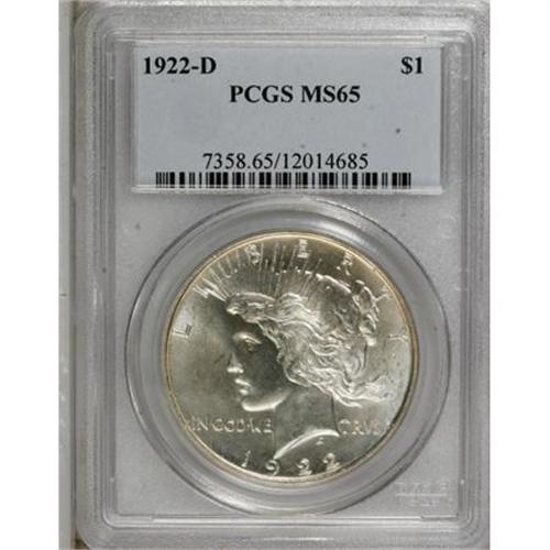 <B>1922-D $1 MS65 PCGS.</B></I> PCGS Population (1008/139). NGC Census: (717/146). Mintage: 15,063,000. Numismedia Wsl. Price for NGC/PCGS coin in MS65: $360. (#7358)<BR><BR><B>Coin Engraver:</B> Anthony de Francisci<BR><BR><b>Shipping:</b> Coins & Currency (<a target="_blank" href="http://www.heritageauctions.com/common/shipping.php">view shipping information</a>)