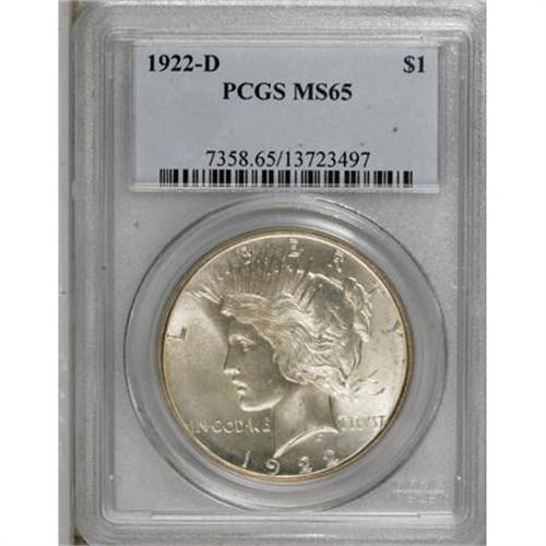 <B>1922-D $1 MS65 PCGS.</B></I> PCGS Population (1008/139). NGC Census: (717/146). Mintage: 15,063,000. Numismedia Wsl. Price for NGC/PCGS coin in MS65: $360. (#7358)<BR><BR><B>Coin Engraver:</B> Anthony de Francisci<BR><BR><b>Shipping:</b> Coins & Currency (<a target="_blank" href="http://www.heritageauctions.com/common/shipping.php">view shipping information</a>)
