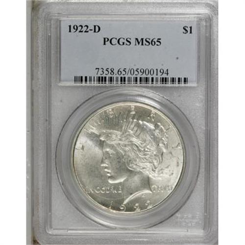<B>1922-D $1 MS65 PCGS.</B></I> PCGS Population (1008/139). NGC Census: (717/146). Mintage: 15,063,000. Numismedia Wsl. Price for NGC/PCGS coin in MS65: $360. (#7358)<BR><BR><B>Coin Engraver:</B> Anthony de Francisci<BR><BR><b>Shipping:</b> Coins & Currency (<a target="_blank" href="http://www.heritageauctions.com/common/shipping.php">view shipping information</a>)