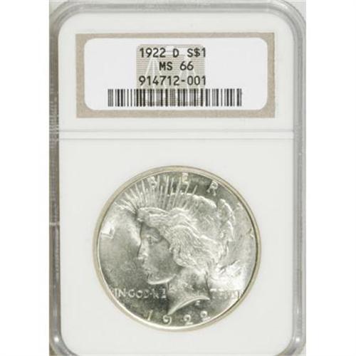 <B>1922-D $1 MS66 NGC.</B></I> Simply outstanding quality with bright, satiny surfaces and a sharp strike overall. Scarce at this lofty level of preservation. NGC has only graded seven pieces finer (11/07). <BR><BR><B>Coin Engraver:</B> Anthony de Francisci<BR><BR><b>Shipping:</b> Coins & Currency (<a target="_blank" href="http://www.heritageauctions.com/common/shipping.php">view shipping information</a>)
