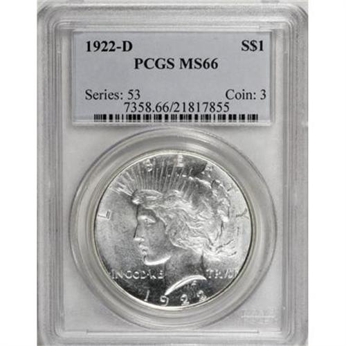 <B>1922-D $1 MS66 PCGS.</B></I> Brilliant and satiny with impressively unblemished fields and devices. Well struck except for trivial incompleteness on the centers of a few letters in LIBERTY.<BR><BR><B>Coin Engraver:</B> Anthony de Francisci<BR><BR><b>Shipping:</b> Coins & Currency (<a target="_blank" href="http://www.heritageauctions.com/common/shipping.php">view shipping information</a>)