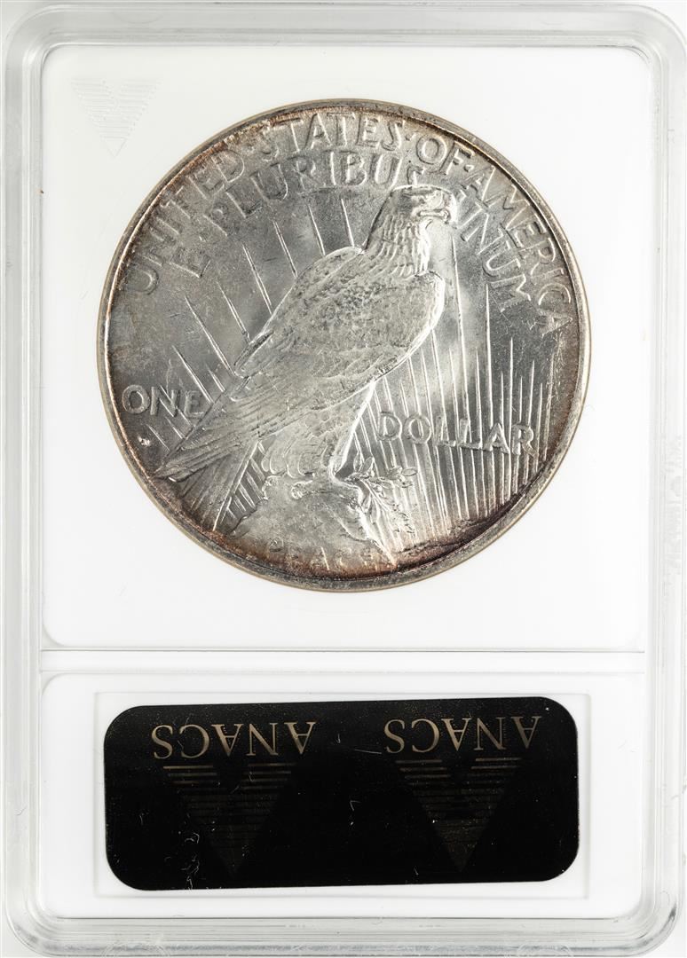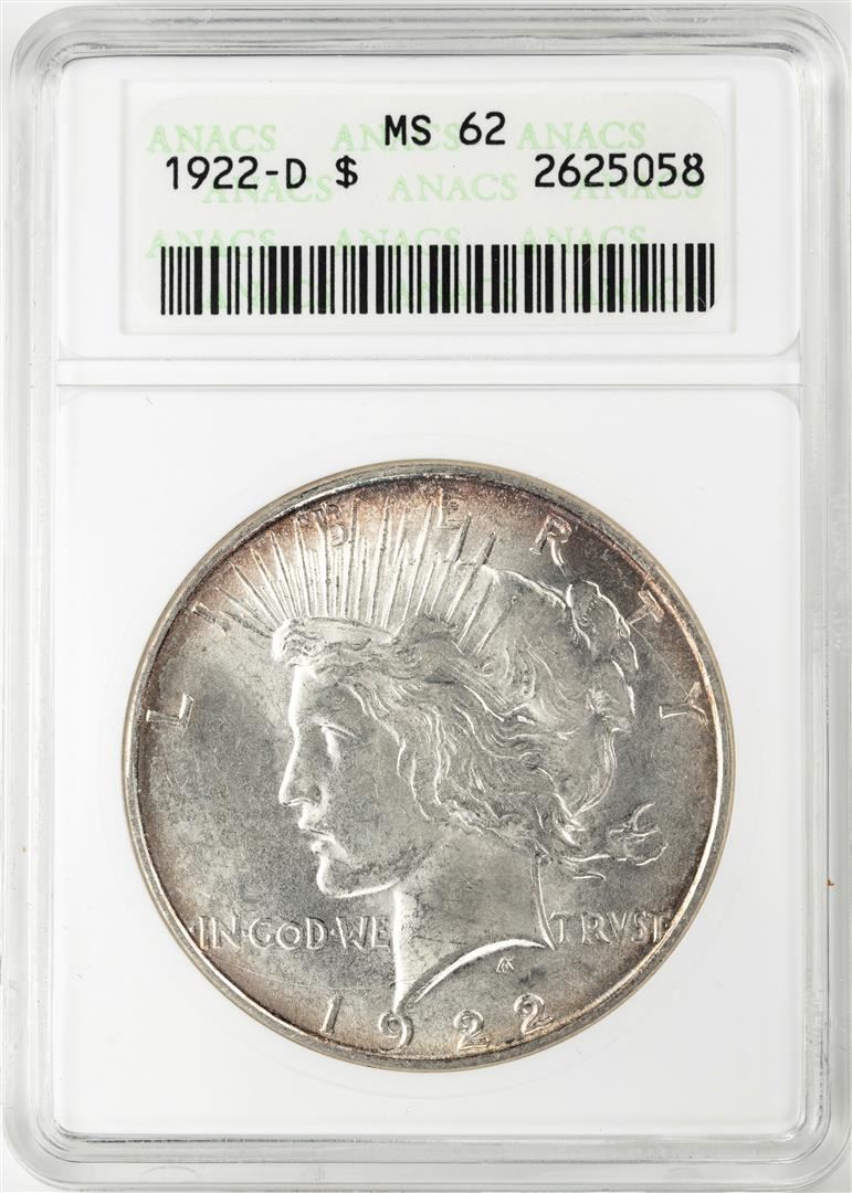 One 1922-D $1 Peace Silver Dollar Coin ANACS MS62. ANACS Certified.