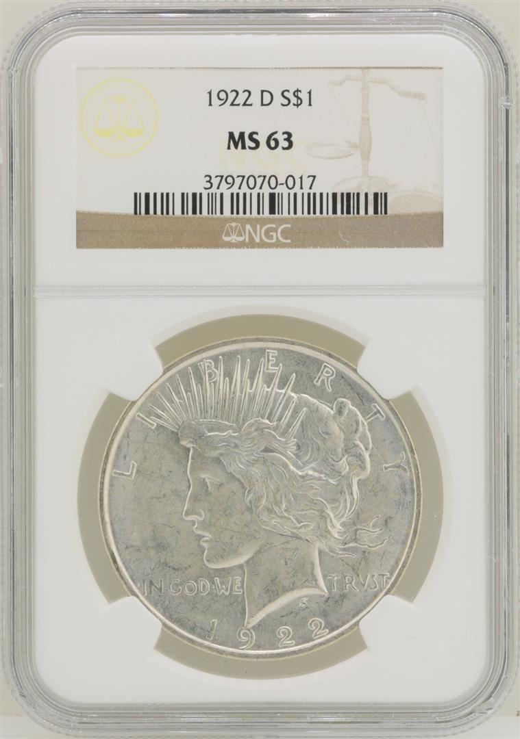 One 1922-D $1 Peace Silver Dollar Coin NGC MS63. NGC Certified.