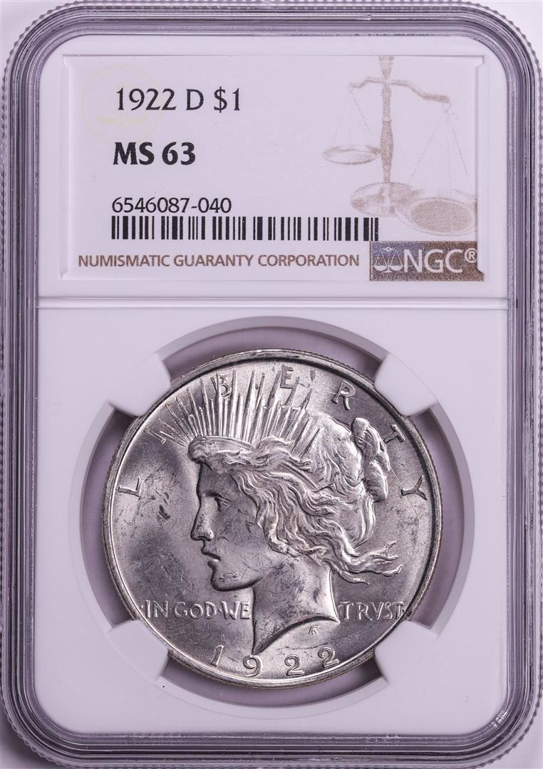 One 1922-D $1 Peace Silver Dollar Coin NGC MS63. NGC Certified.