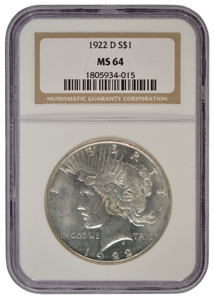 One 1922-D $1 Peace Silver Dollar Coin NGC MS64.