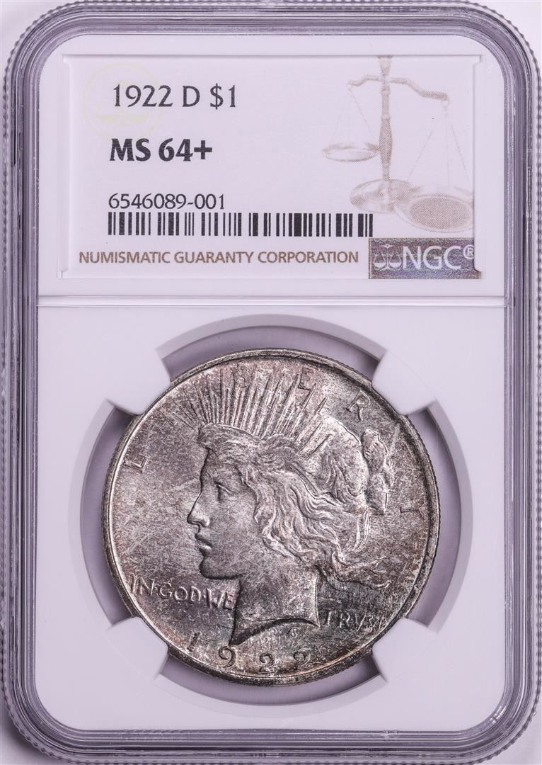 One 1922-D $1 Peace Silver Dollar Coin NGC MS64+. NGC Certified.