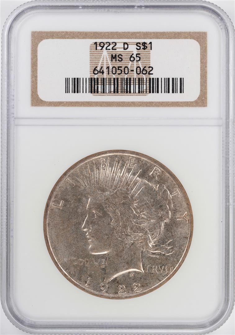 One 1922-D $1 Peace Silver Dollar Coin NGC MS65. NGC Certified.