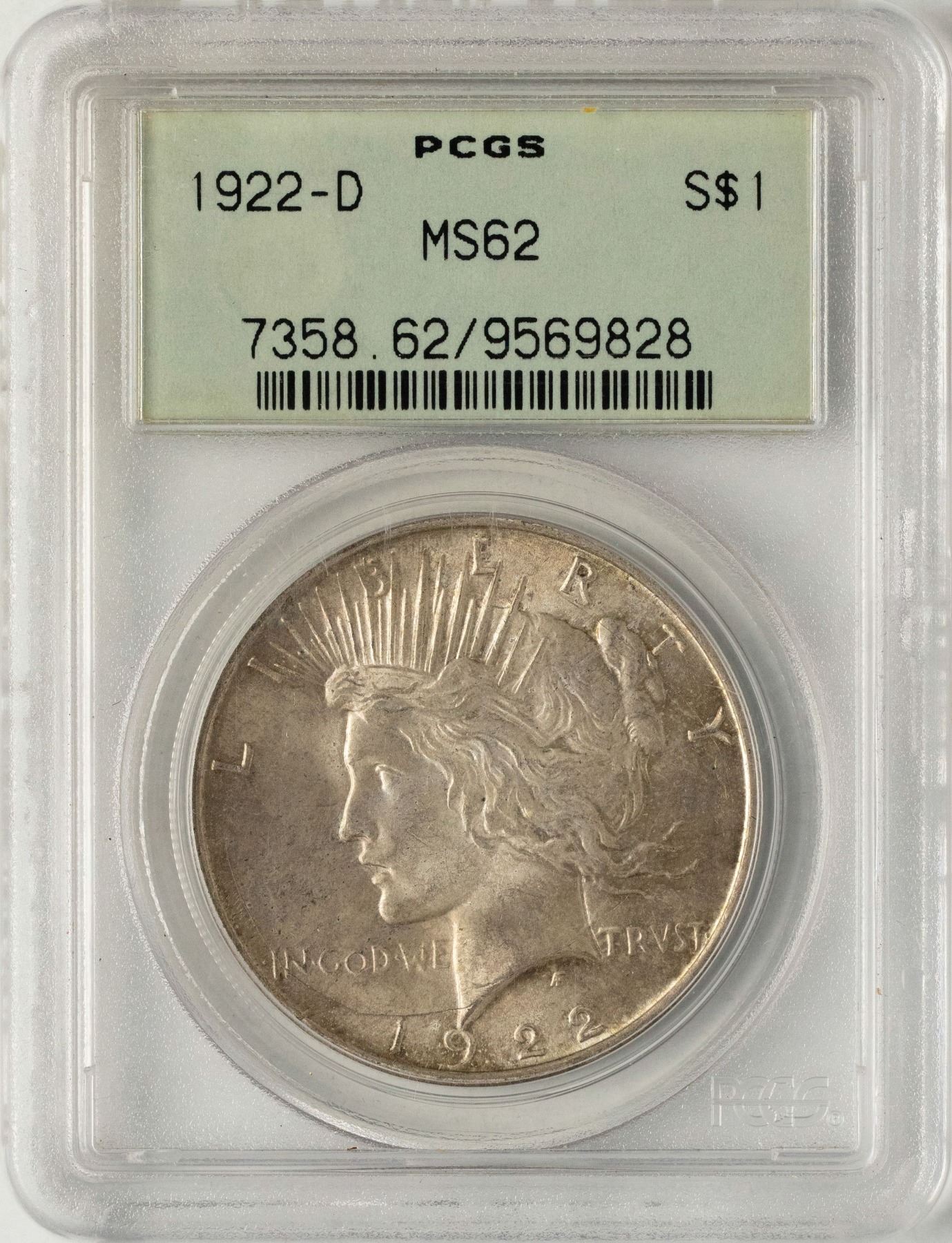 One 1922-D $1 Peace Silver Dollar Coin PCGS MS62 Old Green Holder.