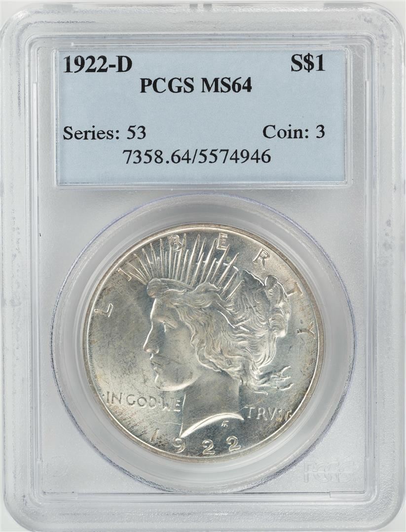 One 1922-D $1 Peace Silver Dollar Coin PCGS MS64. PCGS Graded.